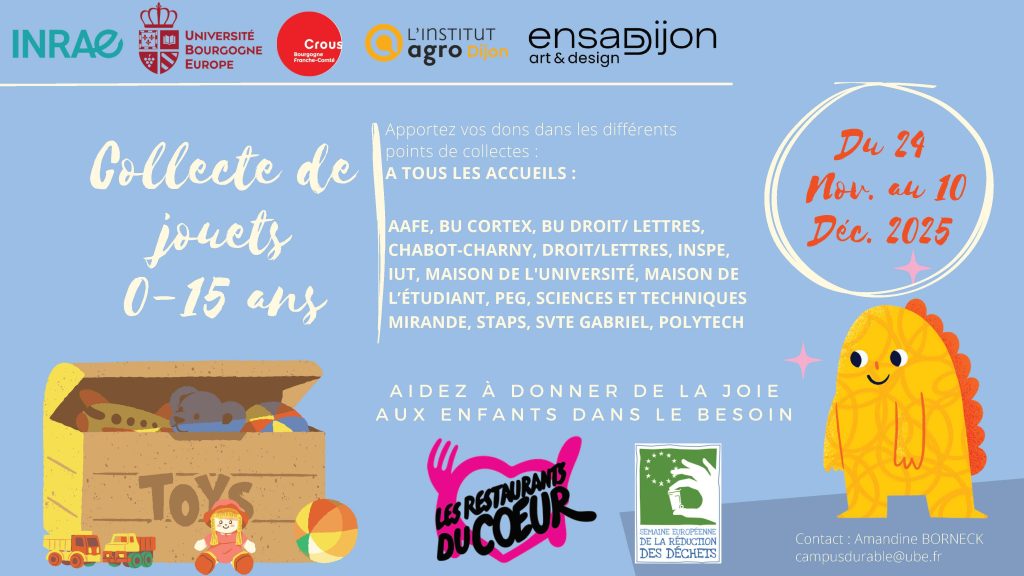 Une collecte de Jouets à destination des Restaurants du Cœur aura lieu du 24 novembre 2025 au 10 décembre 2025. Vous pourrez déposer vos dons dans les cartons mis à votre disposition…