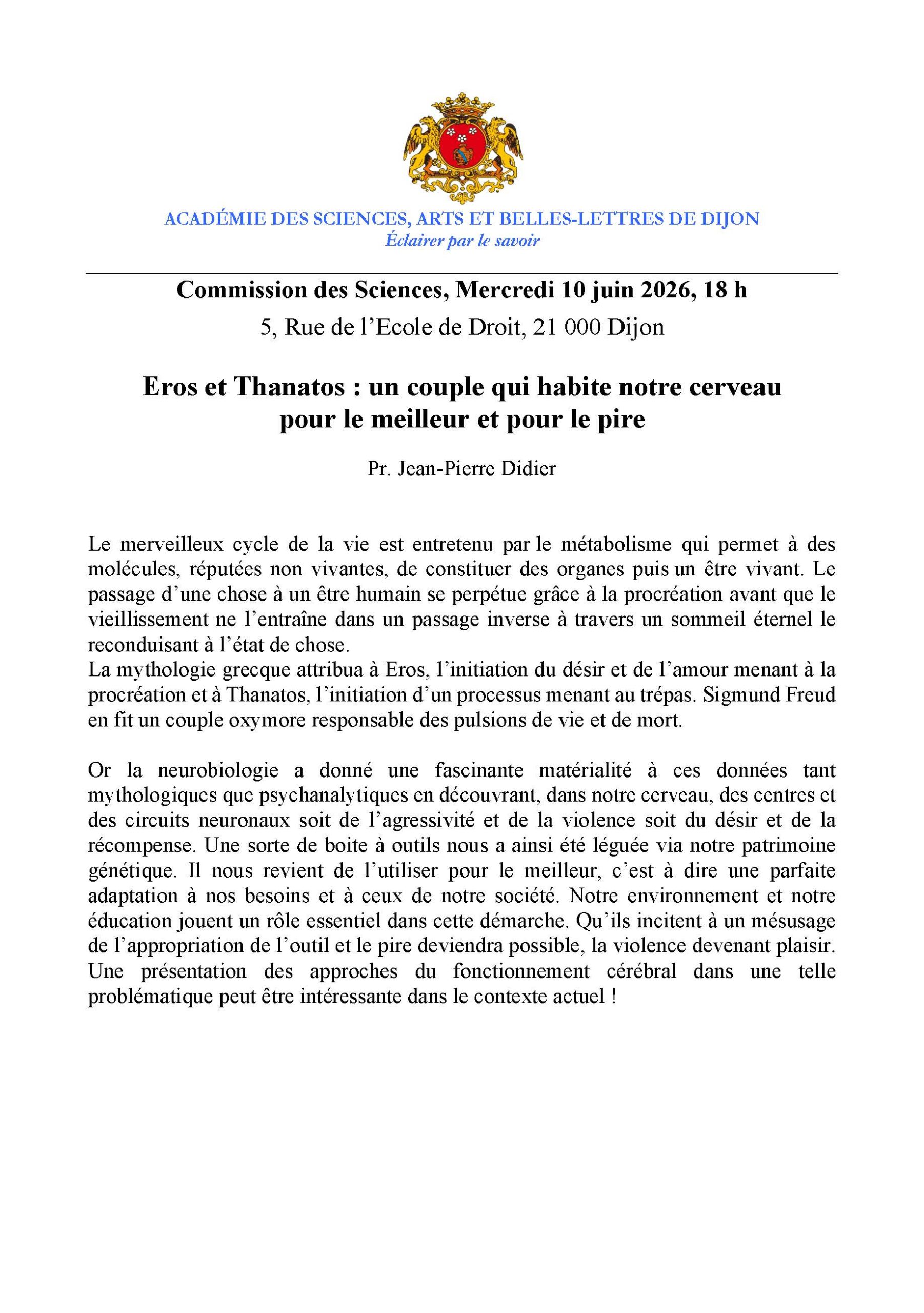 Jean-Pierre Didier. Eros et Thanatos : un couple qui habite notre cerveau pour le meilleur et pour le pire