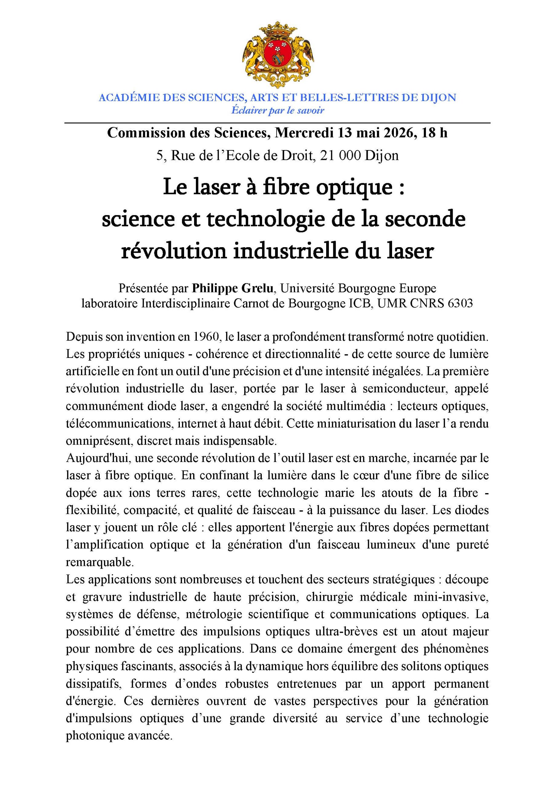 Philippe Grelu (ICB, UBE). Le laser à fibre optique : science et technologie de la seconde révolution industrielle du laser
