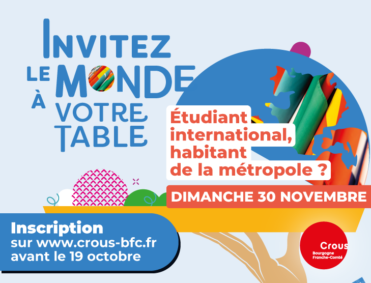 L’événement aura lieu le dimanche 30 novembre 2025. Si vous n’êtes pas disponibles ce jour-là, vous pouvez tout de même vous inscrire et une fois que le Crous vous aura mis en contact avec votre/vos invité(s) vous pourrez convenir d’une autre date pour le repas avec le(s) étudiant(s).